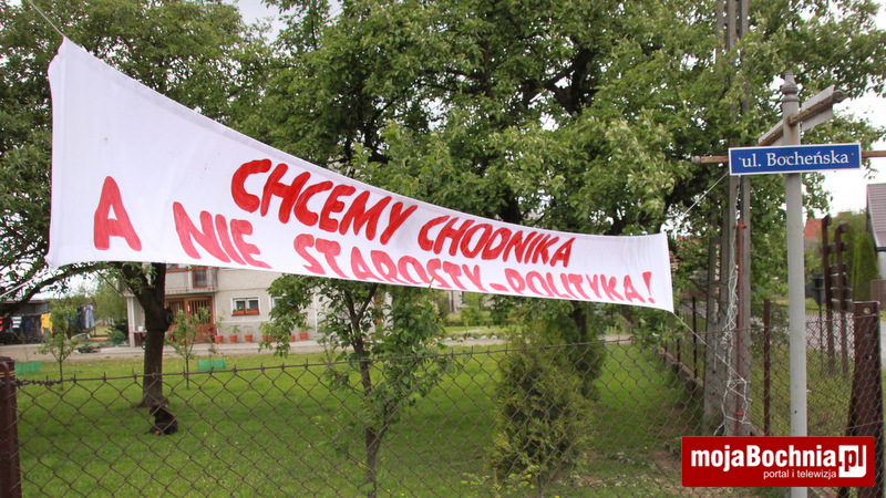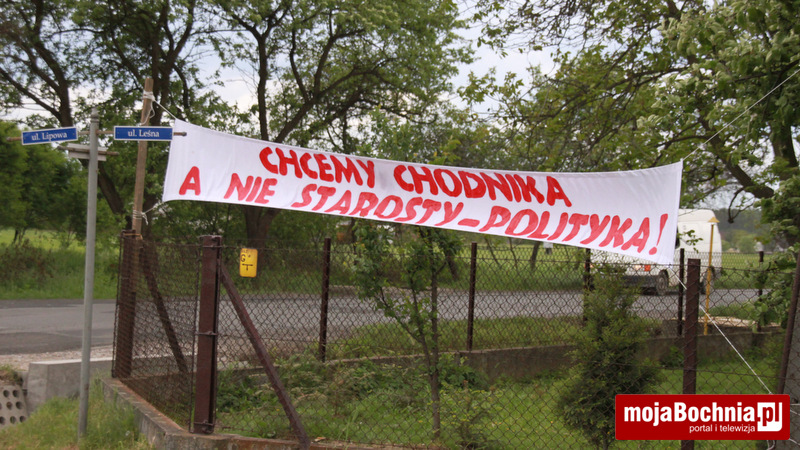 Mieszkańcy Damienic (gm. Bochnia) grożą blokadą drogi. W ten sposób walczą o budowę chodnika. O tym, że są zdesperowani świadczy baner z napisem „Chcemy chodnika, nie starosty polityka”.