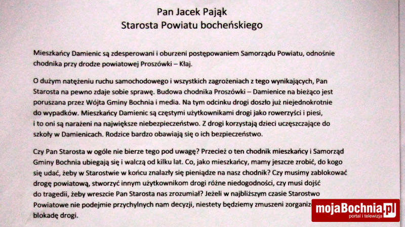 Wicestarosta dodaje jednak, że w budżecie powiatu nie ma pieniędzy na ten cel. Według jego szacunków chodzi nawet o 1,5 mln zł. Dlatego władze powiatu chcą, żeby do inwestycji dołożyła się gmina Bochnia, na terenie której leżą Damienice. Zawsze były deklaracje, poruszane na wielu zebraniach, że wójt gminy Bochnia jest zainteresowany dalszą realizacje tego chodnika. Dlatego nie jest dla nas zrozumiałe, dlaczego wójt nie chce dołożyć się do jego realizacji, jak to robią inni wójtowie – dodaje Tomasz Całka.