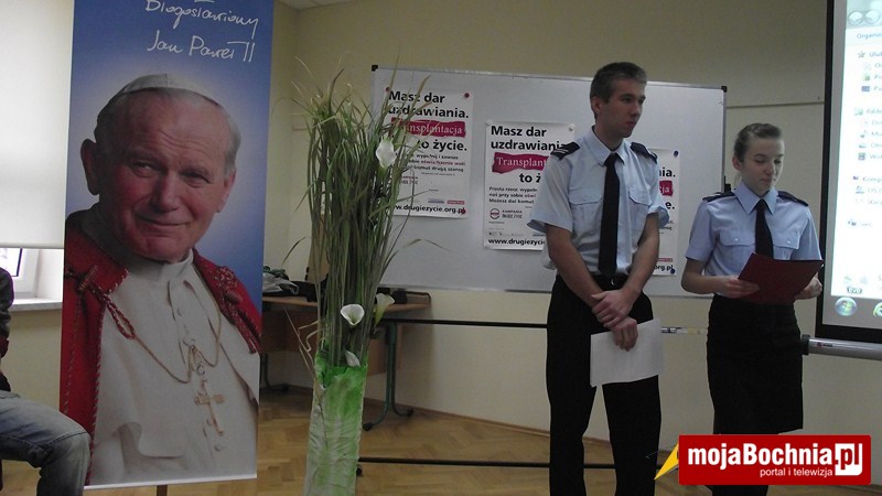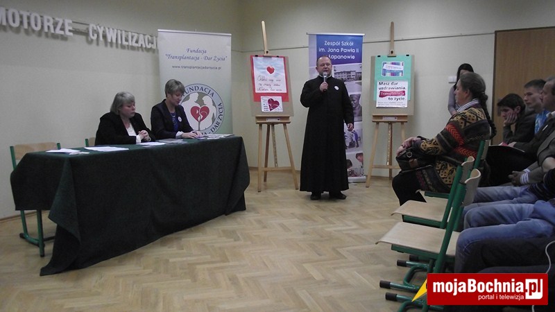 Spotkanie rozpoczęła dyrektor Maria Plewa, następnie ks. Robert Anusiewicz przybliżył zebranym stanowisko Kościoła Katolickiego w sprawie oddawania narządów do przeszczepu. Przywołał postać błogosławionego ks. Carlo Gnocchiego nazywanego „apostołem kalekich dzieci”, który przed śmiercią poprosił o pobranie rogówek dla swojego chorego ucznia. Katecheta mocno podkreślił aprobatę dla transplantologii ze strony Patrona Szkoły – Jana Pawła II.