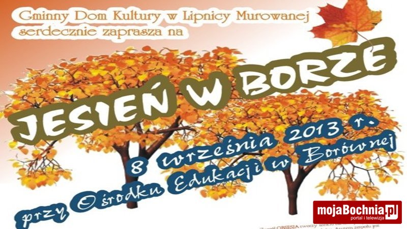Gminny Dom Kultury w Lipnicy Murowanej zaprasza na ostatnią imprezę plenerową „Jesień w Borze” 8 września. W programie min. liczne gry i zabawy dla dzieci oraz dorosłych, występ Orkiestry Dętej z Lipnicy Dolnej, biesiada z Kapelą Ludową „Królewianie” z Królówki oraz festyn z zespołem „Obsesja”.